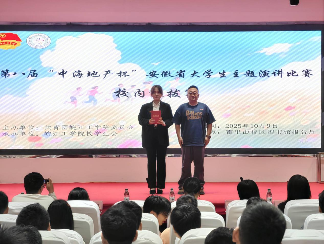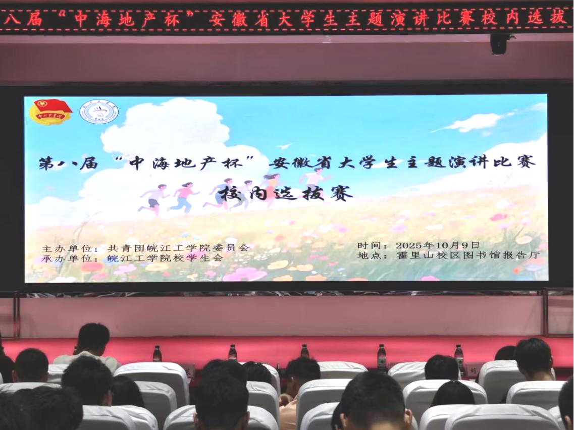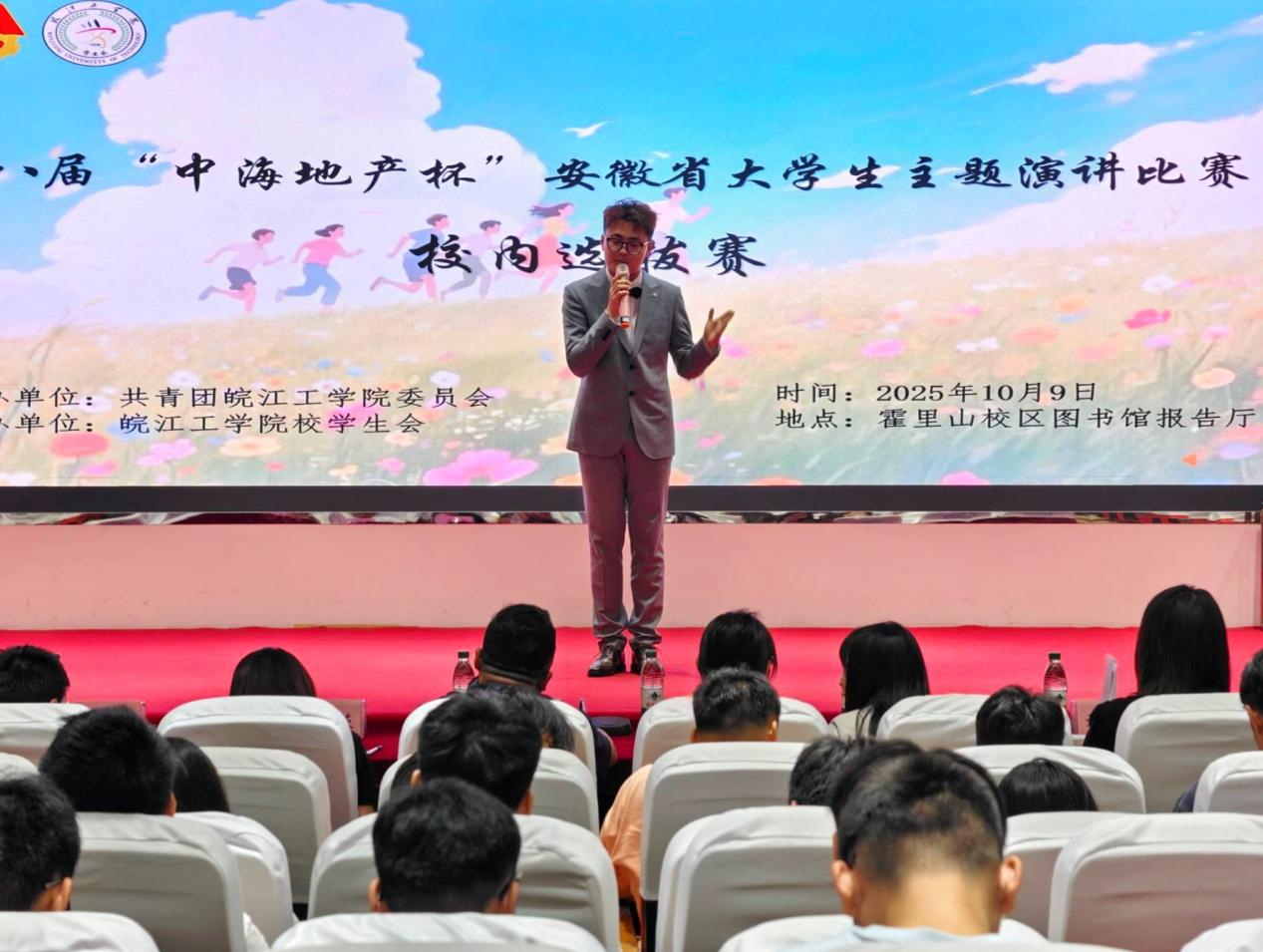 2025年10月9日晚19:00,由皖江工学院校团委主办、校学生会承办的第八届“中海地产杯”安徽省大学生主题演讲比赛校内选拔赛在霍里山校区图书馆报告厅顺利举行。本次比赛以“青春为中国式现代化挺膺担当”为主题,旨在通过演讲的形式,引导广大青年学生坚定理想信念、传承红色基因、弘扬徽州文化、投身社会实践,勇担时代重任。水利工程学院分团委书记陈少博、电信工程学院分团委书记蒋紫姻、计算机与人工智能学院分团委书记尚蓉、机械工程学院分团委书记汪娟、财经学院分团委书记裴维平、艺术设计学院分团委书记刘慧以及校团委组织宣传科副科长翟云霞出席比赛现场。