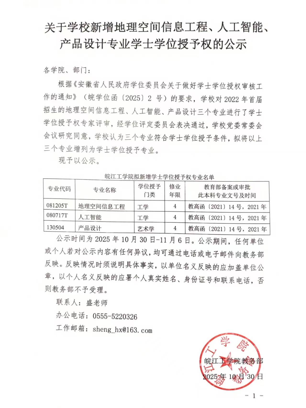 关于学校新增地理空间信息工程、人工智能、产品设计专业学士学位授予权的公示