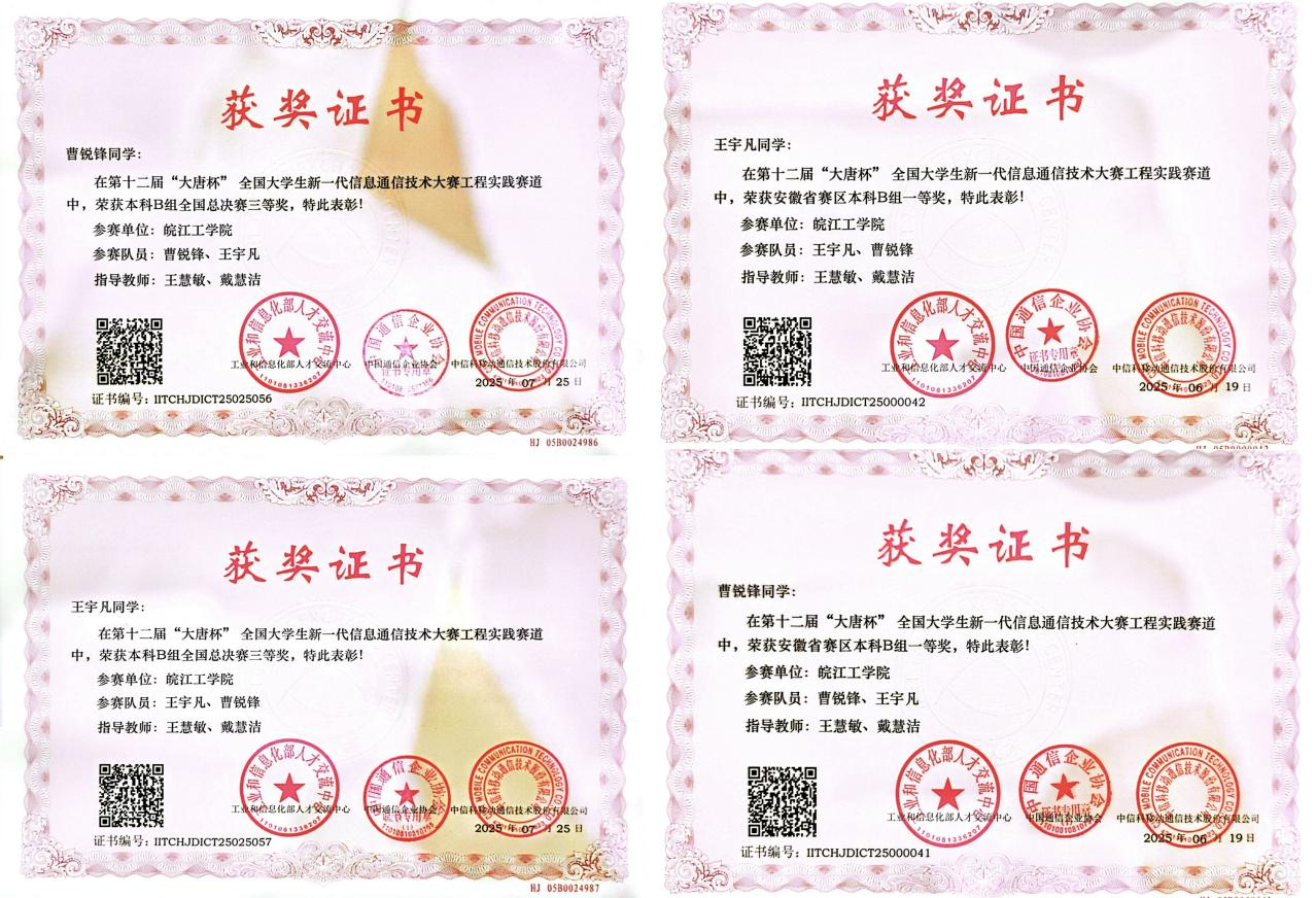 近日,备受全国电子信息领域关注的第十二届“大唐杯”全国大学生新一代信息通信技术大赛(以下简称“大唐杯”竞赛)圆满落幕。皖江工学院电信工程学院曹锐锋、王宇凡两位同学凭借扎实的专业知识、出色的实践能力和稳定的赛场发挥,一路过关斩将,先是在安徽省赛区竞赛中荣获一等奖,并成功晋级全国总决赛,随后在全国赛的激烈角逐中再创佳绩,最终斩获全国三等奖,为我校赢得了荣誉,充分展现了我校通信工程专业的教学成果与学子风采。