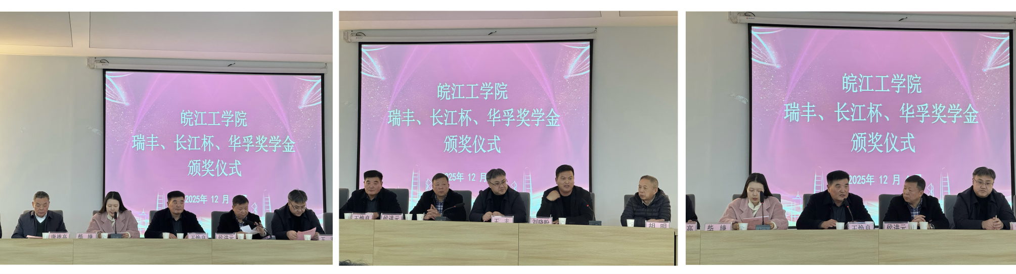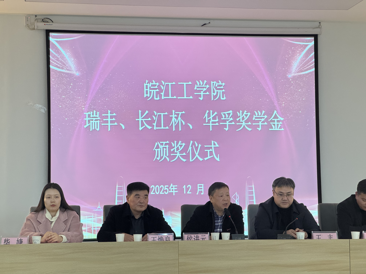 为表彰品学兼优的学子,深化校企协同育人,12月4日下午,皖江工学院在霍里山校区水木楼西301隆重举行2025年度“瑞丰奖学金”“长江杯奖学金”“华孚奖学金”颁奖仪式。安徽瑞丰工程科技集团有限公司董事长王焕良、副总经理吴玉凯、财务总监孙鲜明,安徽省长江河道工程有限责任公司总经理刘晓盼、总经理助理谢春成、人力资源部部长宋小甜,华孚精密科技(马鞍山)有限公司人力资源部主任柴婕,我校副校长侯进元、副校长王志,水利工程学院院长胡明、土木工程学院院长唐德高、机械工程学院党总支书记李东新等相关部门负责人出席仪式。颁奖仪式由学工部常务副部长汪朱华主持。