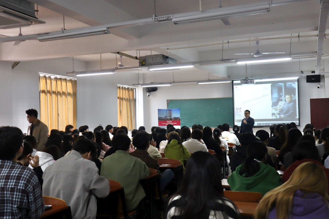 为深化酒店管理专业学生的行业认知,明晰职业发展路径,搭建校企人才对接桥梁,11月12日下午13:00,酒店管理专业在K303成功举办“从酒窖到Corner Office”主题行业认知讲座。本次讲座特别邀请南京景枫万豪酒店餐饮总监,酒店管理2023级普本、2025级专升本全体学生及专业教师代表共同参与这场知识盛宴。