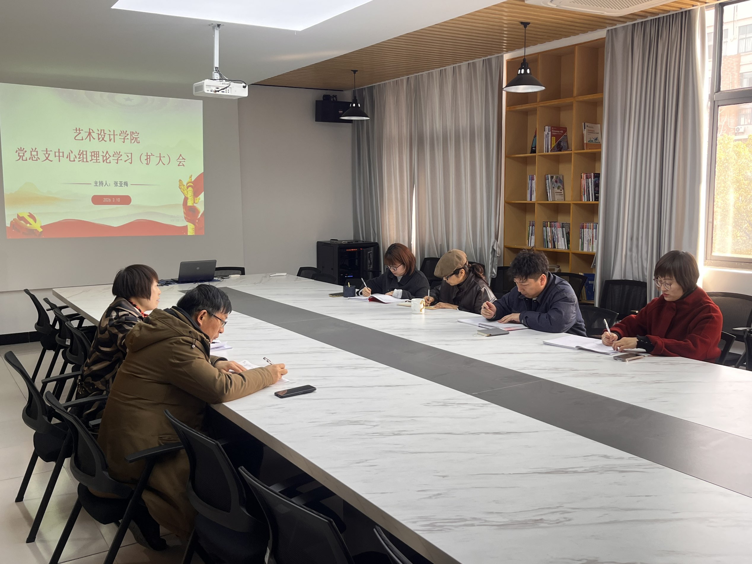 3月10日上午,艺术设计学院党总支在洪雅楼203会议室召开中心组理论学习(扩大)会,专题学习研讨树立和践行正确政绩观。会议由党总支书记张亚梅主持,校长助理、院长伍旭坤以及党总支委员、各党支部书记参加会议。