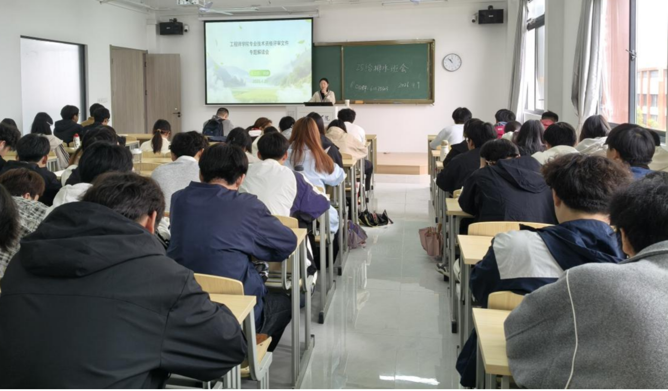 随后,何婷围绕工程系列专业技术资格评审政策展开系统、细致的解读,聚焦给排水专业学生职业发展核心需求,重点介绍了“学历学位+职称证书”的协同培养模式,明确了技术员、助理工程师、工程师三个层级职称的具体申报条件。何老师结合职称评审要求,详细拆解了七项关键指标,同时结合给排水行业发展趋势,梳理了从在校积累、实习实践到职称晋升的分阶段职业成长路径,引导学生对照评审标准,提前谋划学业与职业发展,逐项落实提升任务,树立“早规划、早准备、早提升”的职业意识。