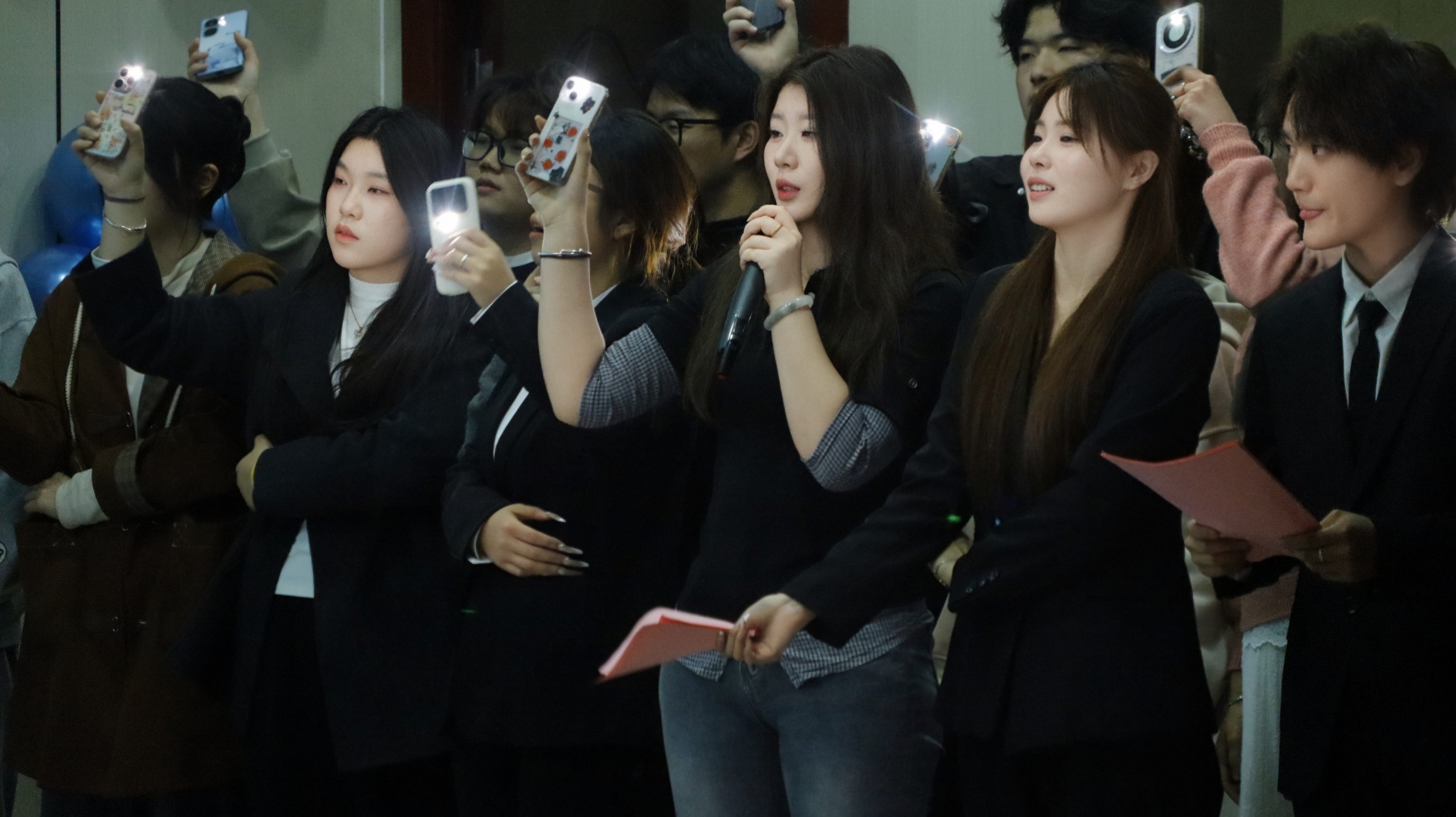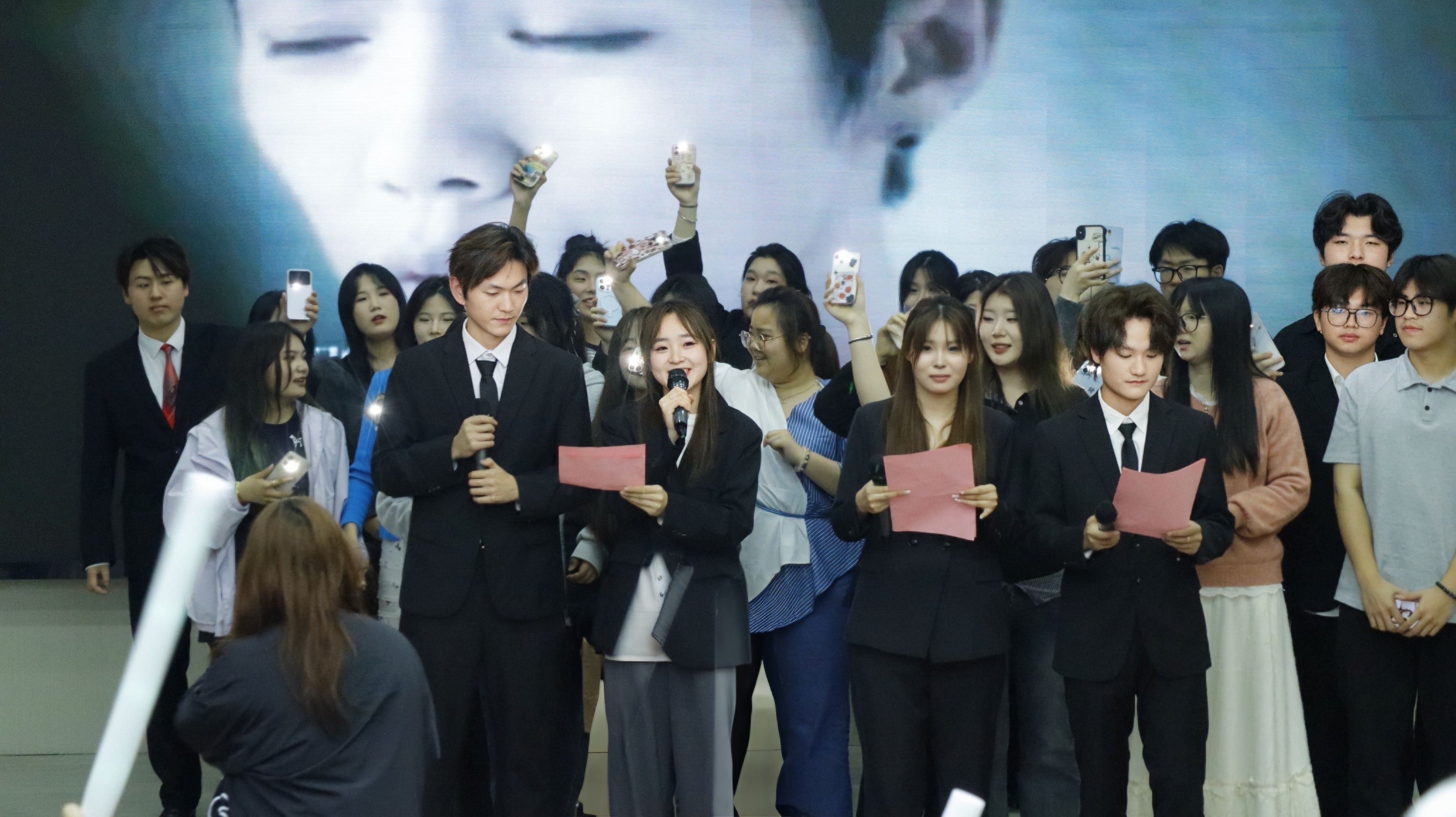 活动最后,全体工作人员与参赛选手携手登台,共同合唱歌曲《我们的明天》。台上选手们挥动手中的手机闪光灯,点点光芒汇聚成璀璨星河;台下观众们挥舞着荧光棒,与台上的光芒交相辉映。悠扬的歌声回荡在报告厅内,温暖的旋律触动着每一位师生的心。