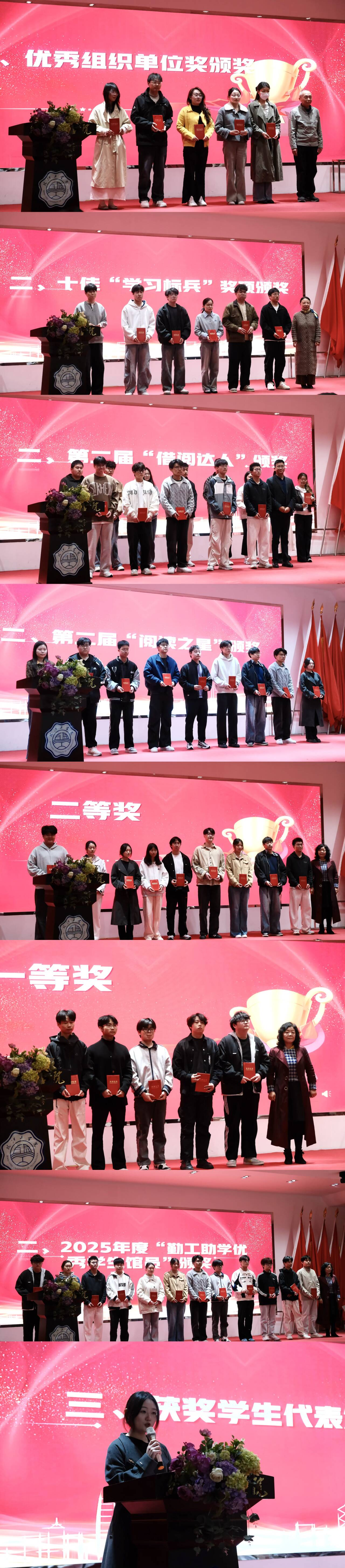 仪式现场举行了第二届“阅读之星”“借阅达人”“学习标兵”、2025年度“勤工助学优秀学生馆员”及“优秀组织单位”颁奖典礼。获奖学生代表葛文悦分享阅读心得,讲述以书为伴、以读成长的收获,传递阅读力量。