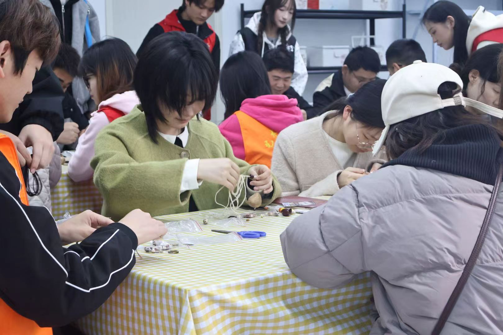 现场氛围积极而有序,居民们充分发挥创意,根据自身审美与喜好挑选果壳、彩绳、配饰等材料,或搭配清新自然的色系,或融入个性创意的组合,打造专属的绿色手作。志愿者们全程陪伴在参与者身边,耐心协助调整果壳排列、优化穿线方式。活动期间,学生党支部书记吴语嫣与佳山乡相关领导就校社共建、美育普及、志愿服务常态化等工作展开交流,探讨依托学院专业优势,持续为社区文化建设注入青春动能的合作路径。果壳风铃制作结束后,大家共同合影留念,定格此次活动的美好瞬间。