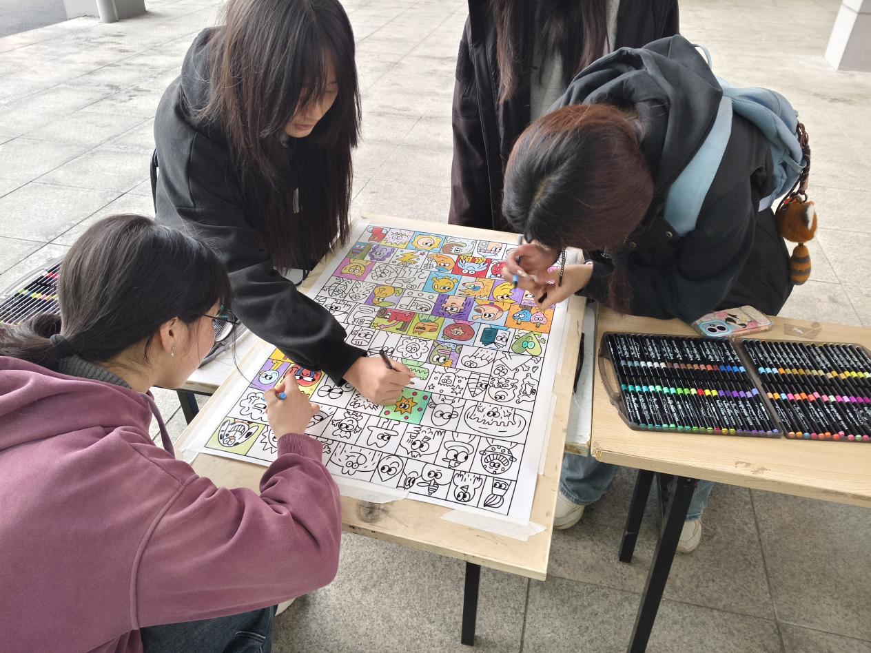 活动现场,一张布满可爱卡通形象的画布铺展在桌前,同学们手持彩笔,自由选择喜欢的图案进行填色创作。大家或低头专注勾勒线条,或互相交流配色灵感,在色彩的碰撞中释放压力、舒缓情绪。同时,活动还设置了心情便签墙,同学们将自己的春日期许、情绪感悟写在便签上,粘贴在装饰着多彩纸花的展板上,用文字传递温暖与力量。