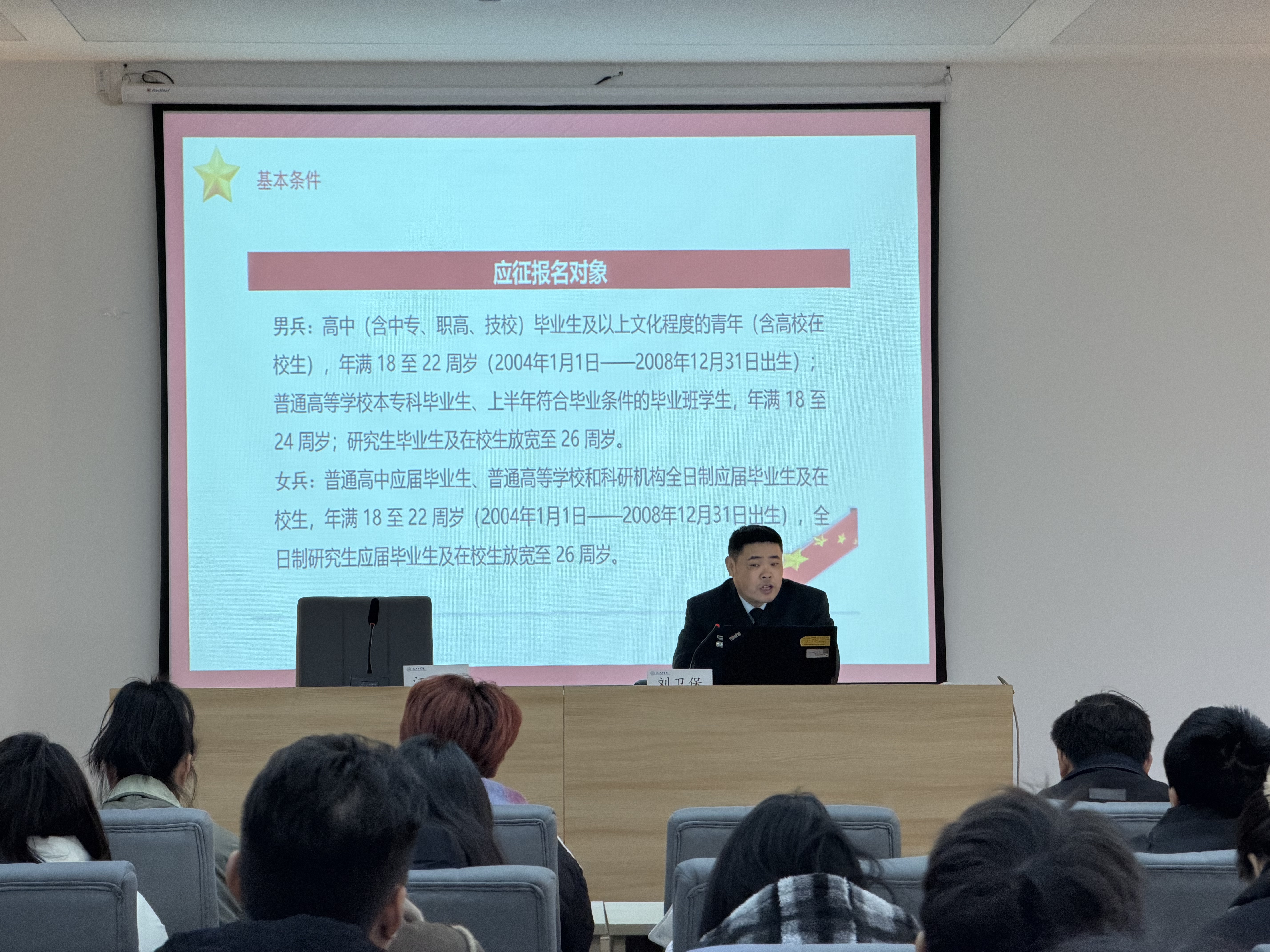 宣讲会伊始,汪朱华副部长围绕在校大学生入伍的核心要求、报名流程、学籍保留、学业衔接等关键事项展开详细说明。他强调,大学生参军是响应国家号召、投身国防事业的光荣选择,学校将全力为入伍学子提供学籍管理、学业帮扶等全方位支持,切实解决同学们的后顾之忧,鼓励符合条件的学子把握机遇,在军营中锤炼意志、增长才干,以青春之力守护家国安宁。