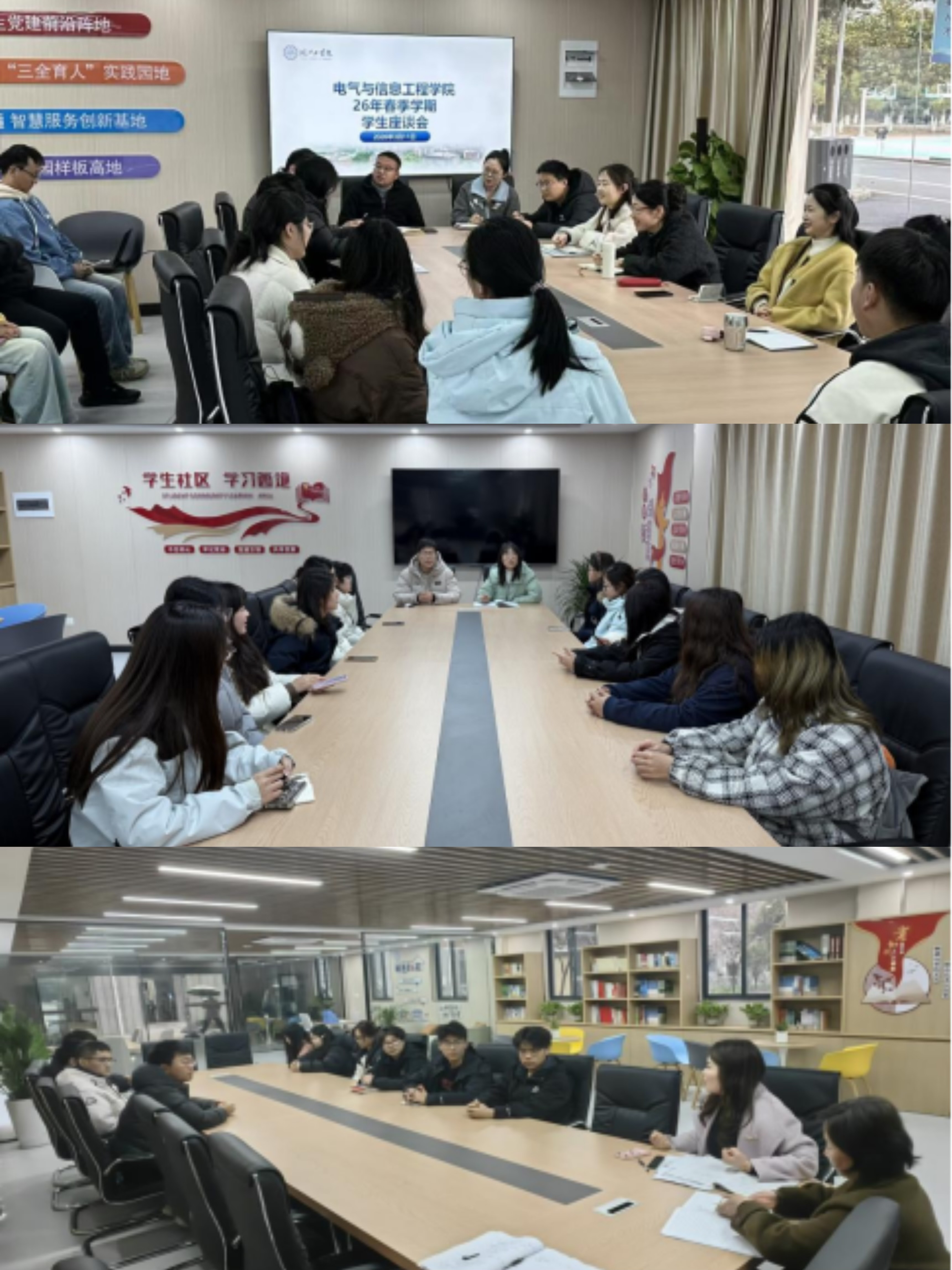 各学院座谈会集中在3月9日至13日开展。座谈会上,不同年级、专业的学生代表结合自身实际,围绕学业规划、考研实习平衡、学科竞赛、实训安排、就业指导、宿舍后勤保障等核心议题畅所欲言,既提出了针对性的意见建议,也展现出主动关心学院发展的主人翁意识。面对学生们关切的各类诉求,各学院参会人员全程认真倾听、细致记录,现场逐一进行答疑解惑,对能当场解决的问题立即落实,需协调推进的明确办理时限与责任分工,切实做到“事事有回应、件件有着落”。各学院同时结合专业特色与学生需求,精准回应了考研备考帮扶、专业课程优化、实践资源统筹、行业就业规划等关键问题,并表示后续将全面梳理意见建议,建立整改台账、实行闭环管理,全力解决学生急难愁盼。