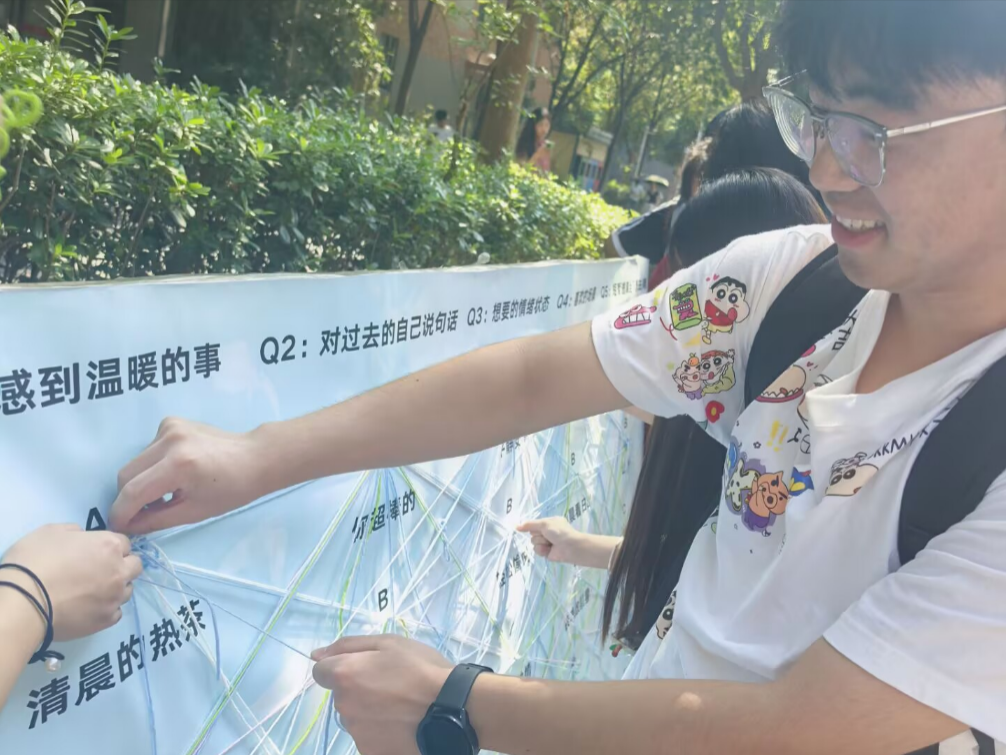 活动现场,一块印有“清晨的热茶”、“朋友的趣事”、“你超棒的”、“辛苦啦”等温暖词汇的展板吸引了众多同学驻足。大家从工作人员手中领取各色毛线,认真选择最能代表此刻心境的词语,将毛线轻轻缠绕在对应选项周围——浅蓝色织出“陌生人的善意”,明黄色勾勒“未来可期”,五彩的毛线渐渐交织成一幅幅独特的“心灵地图”。在指尖缠绕的过程中,不少同学坦言“焦虑好像随着毛线的缠绕慢慢落地了”。