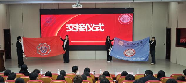 交接仪式环节,第五届主席团董盛华、查杨静怡与第六届主席团张萱、学生委员刘婉君完成交旗仪式,传递服务初心与责任担当。第六届执行主席汪紫昕上台发言,承诺将以“倾听同学心声、丰富活动形式、完善内部制度”为核心,打造更具凝聚力的团队;干事代表刘子君分享服务初心,表态将以“勤学善思、团结协作”的态度投身工作。