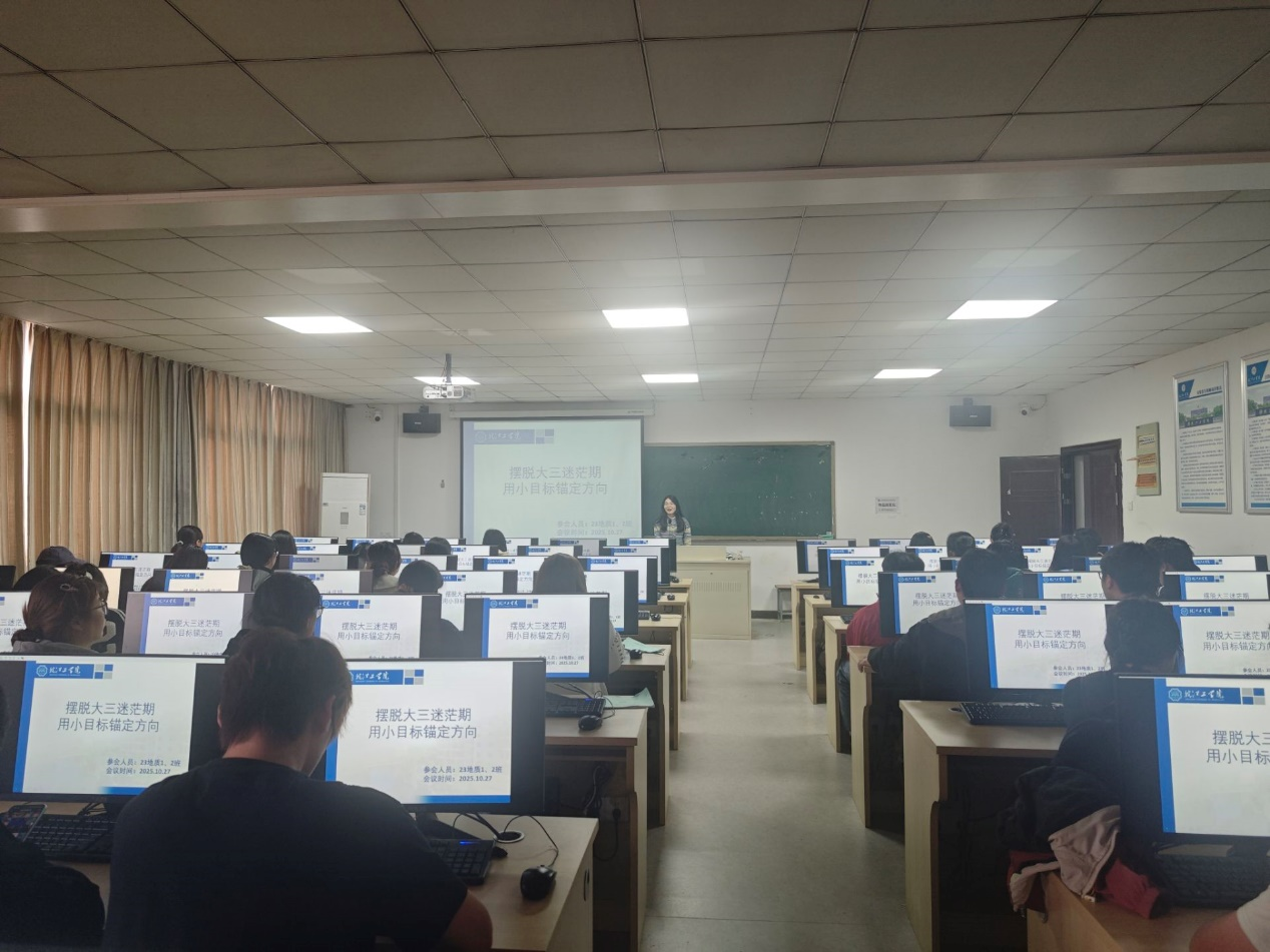 为破解大三学生在“专业深化与职业选择”阶段的迷茫困境,帮助学生以清晰目标规划成长路径,10月27日,土木工程学院2023级地质工程专业在至善楼E413召开“摆脱大三迷茫期,用小目标锚定方向”主题班会。本次班会由班主任耿瑞娟主持,专业全体学生参会。