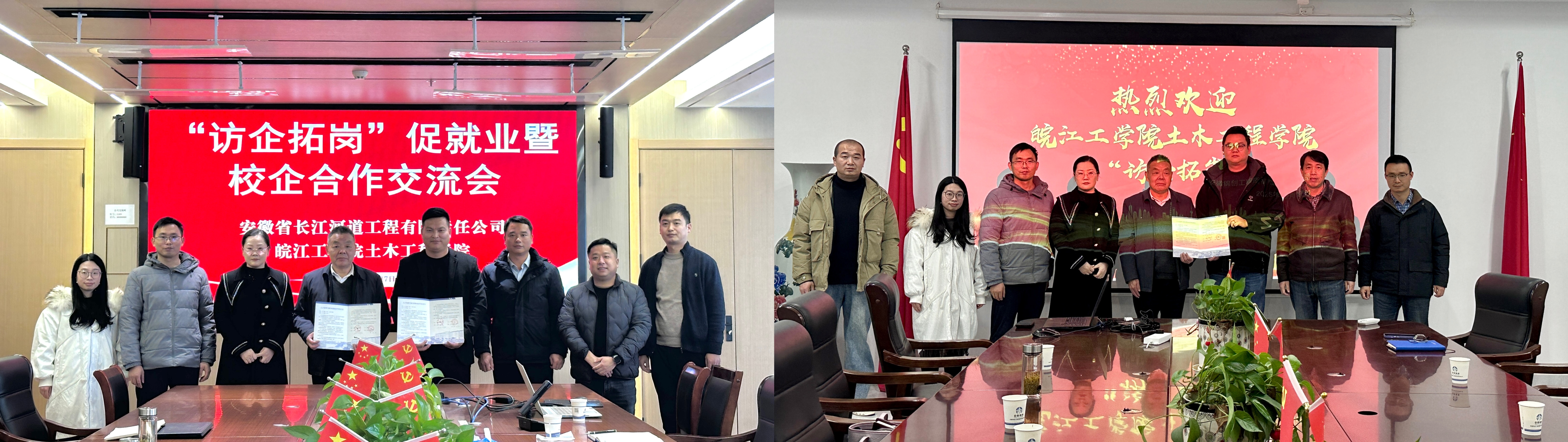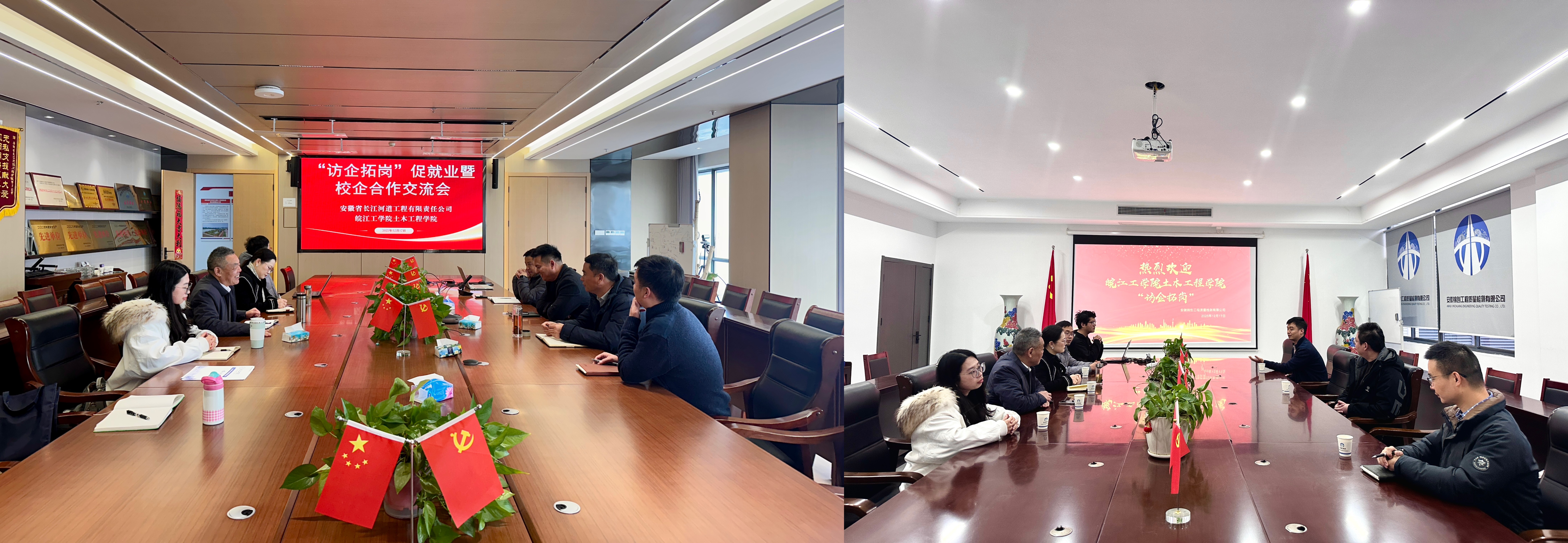 为拓宽毕业生就业渠道,深化产教融合与校企协同育人,12月17日下午,土木工程学院先后走访安徽省长江河道工程有限责任公司与安徽锦创工程质量检测有限公司,开展“访企拓岗”促就业暨校企合作座谈交流,并与两家企业分别签订了人才培养与就业基地建设合作协议。安徽省长江河道工程有限责任公司总经理刘晓盼,总工程师、副总经理汪海生,总经理助理兼质量技术中心主任韦伟,董事会助理胡辰辰;安徽锦创工程质量检测有限公司董事长谢春成、副总经理陈开金、质量安全部长沈琪琦、中心试验室主任郭岩;学院院长唐德高、副院长李杰如、院长助理韩雪、专任教师刘胜博士等参加了本次活动。
