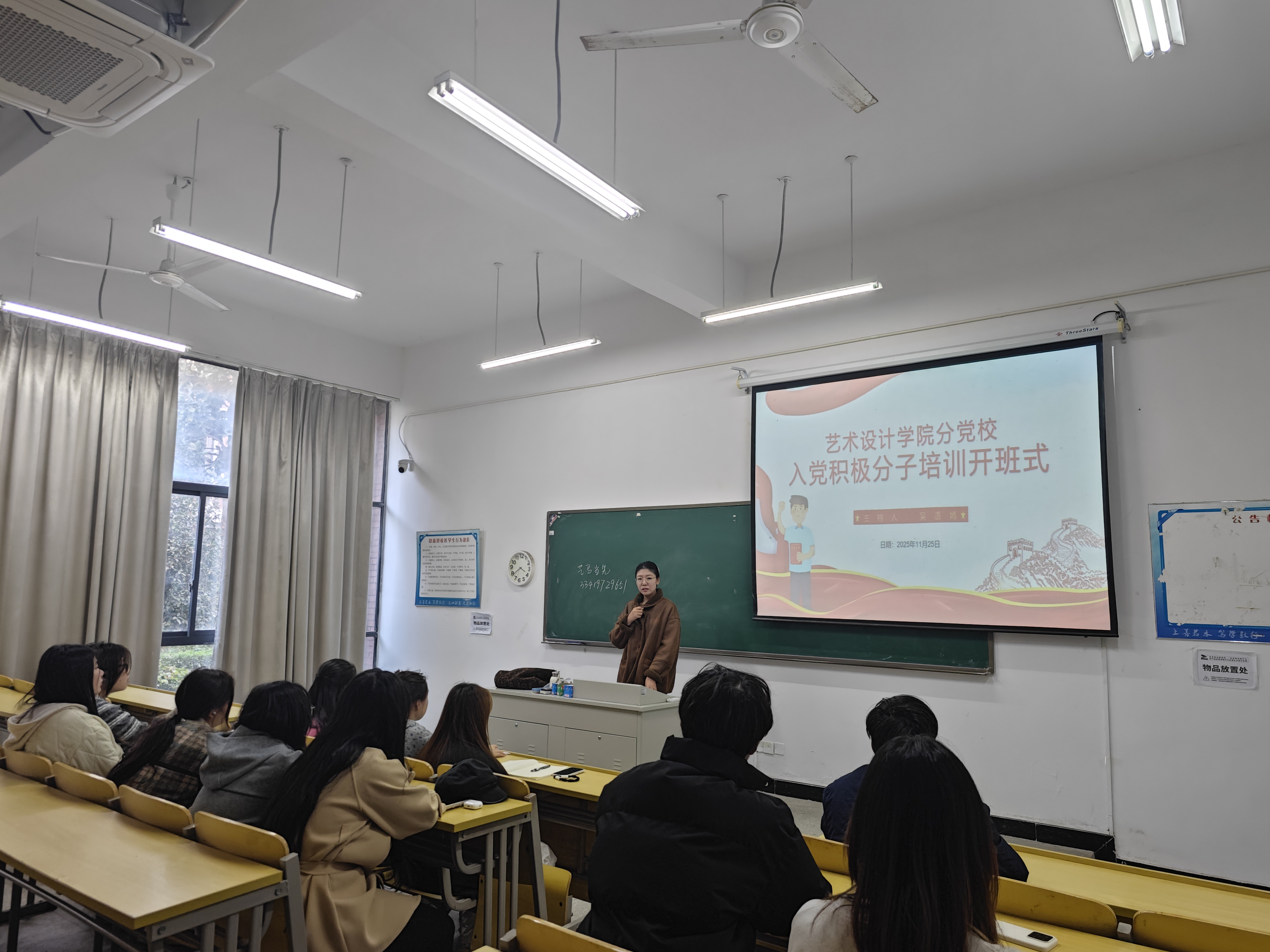 2025年11月25日,艺术设计学院分党校第 14 期入党积极分子培训班正式开班。艺术设计学院组织员吴语嫣、学生党支部组织委员左镜鸥老师及全体入党积极分子参加开班仪式,此次培训为青年学子追求进步、向党组织靠拢搭建了重要学习平台,是学院深化党建育人、筑牢青年思想根基的关键举措。