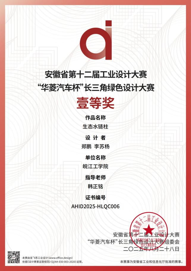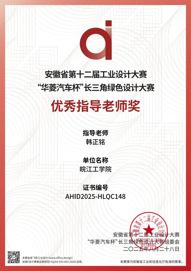 近日,安徽省第十二届工业设计大赛“华菱汽车杯”长三角绿色设计大赛颁奖典礼在马鞍山市隆重举行。皖江工学院艺术设计学院师生团队凭借出色的创新设计与扎实的专业能力,在众多参赛院校中脱颖而出,荣获大赛“优秀组织奖”,并且斩获一等奖1项、三等奖及其他奖项共11项,总计获奖12项,指导教师韩正铭获评“优秀指导老师”。